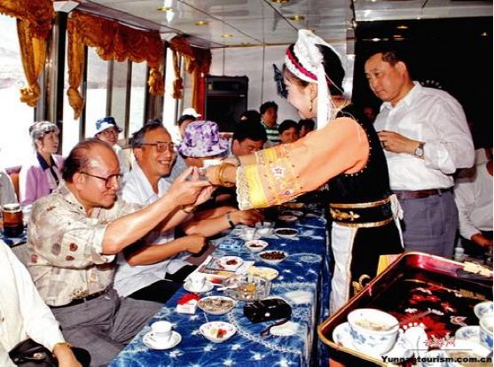 白族热情好客,先客后主是白族待客的礼节。家中来了客人,以酒、茶相待。著名的“三道茶”就是白族的待客礼。但白族人倒茶一般只倒半杯,倒酒则需满杯,他们认为“酒满敬人,茶满欺人”。受到白族人热情的款待,应说声“挪卫你(谢谢)”来表示你的谢意和感激之情。
