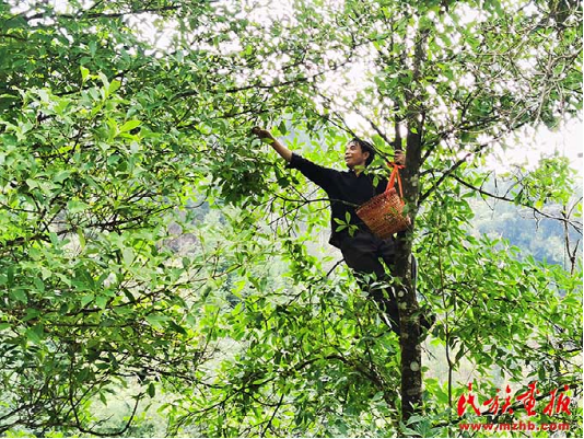 罗运村村民在树上采摘八角。