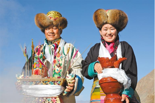 曲水县协荣村春耕仪式上,身着盛装的村民端着切玛和青稞酒。