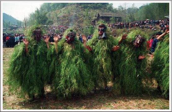 苗族芒篙的固定形象,是面带古怪的木傩面具,身披齐膝的虎卧藤,手持过头的竹棍,小腹前挂着长长的象征男性生殖器之物,它们单数组合,多为11——15个。
