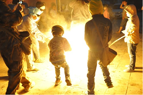 不到黄昏,鞭炮声就响起来了。新生儿的父亲点燃火把后,孩子们迫不及待地拿着小火把和松明粉,跑来跑去烧新生儿的的各种亲戚,大人们乐呵呵地接受孩子们喷洒过来的火焰,并一致说着很吉祥的祈愿祝福语。“从此晦气不在喽!”、“一年更比一年好呀!”、“红红火火又一年”。男女老少在火把树下吃喝玩乐,其乐融融。糖、炒蚕豆、梨、苹果等被大家传来传去,新生父亲挨个向亲友敬酒。亲友邻居喝着喜酒,一致祝福新生儿安康成长,将来富贵吉祥。