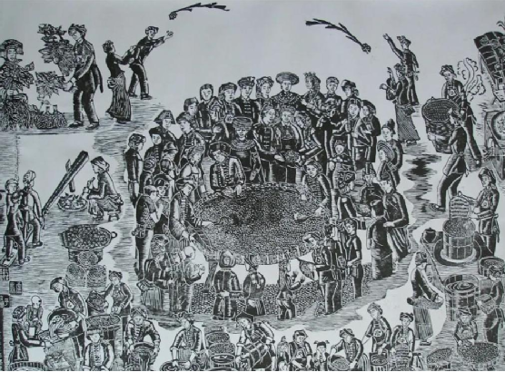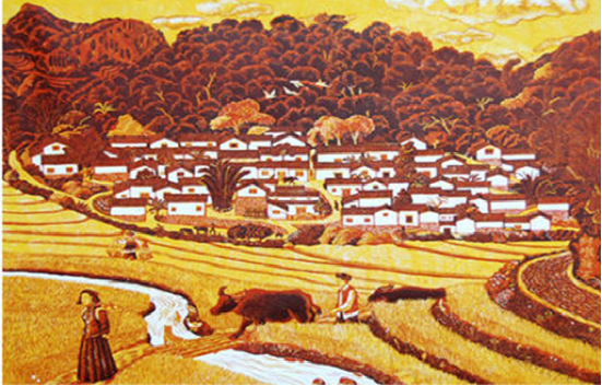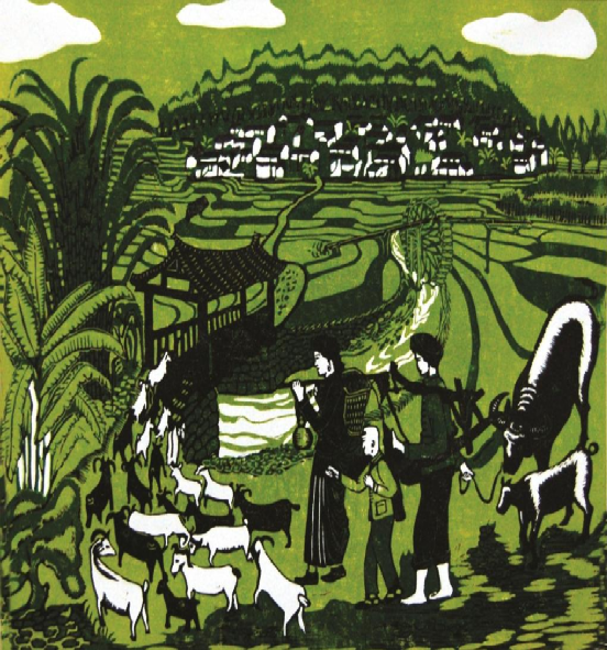 云南马关壮族农民版画起源于马关县仁和镇阿峨新寨村,“以刀代笔”是其主要的艺术形式,刀法粗犷、豪放而不乏细腻,具有浓郁的乡土气息和深厚的民族文化内涵。