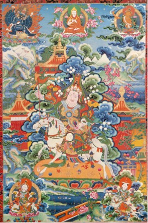 勉塘画派是15世纪以后影响最大的绘画流派,主要流行于卫藏地区及昌都部分地区。该画派的创始人是勉拉顿珠,他出生于洛扎勉塘(今山南地区),勉塘画派由此而得名。他大约出生于公元十五世纪20年代或30年代。据史料记载,勉拉顿珠出生的时间正好与他家乡发现了朱砂矿的时间一致。这种重要绘画颜料的出现,预示着一代绘画大师降临人世。他自幼聪慧,毫不费力地学完各种字体的书写、大小五明中的绝大多数内容。成年后,拜后藏一带的著名美术大师多巴扎西杰布为师,苦心钻研,在绘画艺术领域取得了很深的造诣。通晓了藏、汉、印、尼泊尔等各种绘画派别的技法,他根据《续部》等编写了绘画理论专著《造像量度如意宝》,并创立了勉塘画派。他参与了一世达赖喇嘛根敦朱巴与1447年创建的扎什伦布寺措钦大殿壁画绘制工程的全过程,单独完成了北壁的《释迦牟尼与十六罗汉图》与《八十大成就者环围金刚持》两幅壁画,在西壁勉拉顿珠亲手绘制了《释迦牟尼十二宏化图》的白描部分。另外在该寺以及同时代建造的诸多庙宇绘制完成了大量的壁画、巨幅堆秀唐卡及小型唐卡。其中最负盛名的是扎什伦布寺的巨幅堆秀唐卡《释迦牟尼》,其大小约为长32.9米、 宽19.3米。该画派造像法度精严,与传统的表现手法相比,尤其注重线条的运用,线条工整流畅,色调活泼鲜亮,变化丰富,人物体态、骨相和肌肤都异常完美,脖颈较长,高度和谐的色彩和色调的配制十分突出。画面晕染充分,用色细腻、柔和、富丽堂皇。由于石青和石绿色突出,从远处看,绘画作品十分优美和静。衣袍和饰带呈不对称形式,棋格使构图消失,诸神位于云端风景之中,布局活跃多变,背光中卷草图案等变成了波浪式放射的金线,该派擅长表现和静类神像。