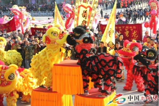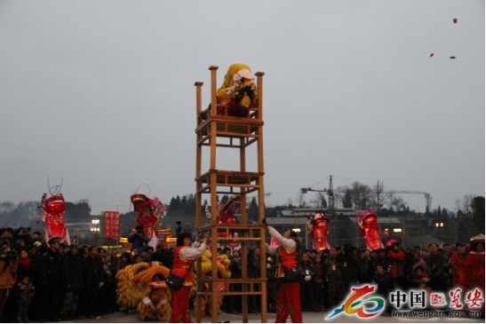 在贵州瓮安的草塘,春节期间不只有舞龙表演,还有舞狮。舞狮代表欢乐和人们心中的祝福,是美好生活的象征。高台舞狮因其含有杂技表演,最受群众喜爱。