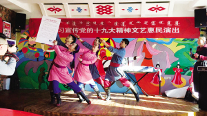 2017年12月6日,察右后旗乌兰牧骑赴白音察干镇白音淖尔嘎查进行党的十九大宣传慰问演出。图为舞蹈《总书记回信了》。