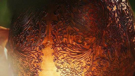 制作师傅对着一个约半米宽的“工作间”,头顶点上一盏小灯,然后将待打磨的成品套在转轮上,先用粗砂石和细砂石将釉面磨平,再用黄石、椴木细磨,直到磨出景泰蓝特有的光亮。旋转的成品和喷溅的水流构成了一曲愉悦的劳动者之歌,就在这样的旋转中,景泰蓝告别黯淡,周身散发出新鲜的光彩,经镀金工序后更显出华贵的艺术气质。