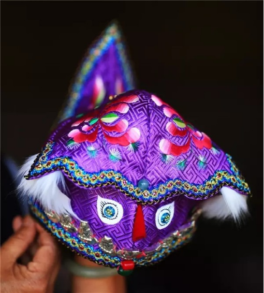 走进杨文焕的工作室,犹如进入一个明媚鲜艳的梦境。首先映入眼帘的,便是那一顶顶色彩鲜艳、绣工精致的童帽:造型大方、线条流畅的狮子帽;色彩明艳、虎虎生威的老虎帽;精巧别致、活泼可爱的翘尾帽;高雅富丽、古韵悠长的公子帽;别具一格、特色鲜明的牌坊帽。