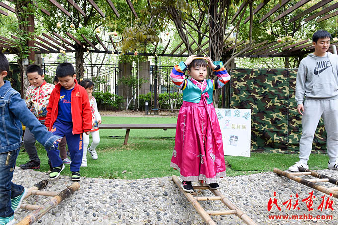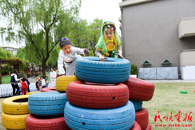 畲族的“摘柿子”、维吾尔族的“赛马”、黎族的“跳竹竿”、蒙古族的“射箭”……天恒名都幼儿园的操场上,孩子们正积极参加各种民族游戏活动,沉浸在无忧无虑的快乐中。4月13日,是上海市莘庄工业园区天恒名都幼儿园的“民族接力棒小社团”活动日,孩子们非常期盼这每周一次的活动日。
