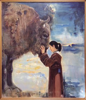 雍忠卓玛的个人画展受到业内外的诸多好评,也有观众专程从外地去拉萨观展。展览结束当天,雍忠卓玛特意和画作《我和它》合影,并将合影发布在社交平台上。“这是我与牦牛博物馆结缘的作品。”她向记者介绍。画面上,穿着藏袍的少女闭着眼睛,用左手抚摸牦牛的面颊,额头轻触牦牛鼻尖,表情宁静祥和。