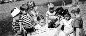 1950年,联合国国际育童学校的孩子们在阅读第一张《世界人权宣言》的海报。
