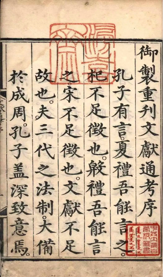 内蒙古党校图书馆藏《文献通考》三百四十八卷,(元)马端临撰,明嘉靖三年(1524)司礼监刻本,一百四十六册二十九函。版框高二十五点七厘米,宽十七点六厘米;开本高三十三点二厘米,宽十九点九厘米。半叶十行行二十字,小字双行同。粗黑口,四周双边,双对黑鱼尾。鱼尾中镌书名、卷数、页码。卷前首列嘉靖三年(1524)明世宗《御制重刊文献通考序》,次列至治二年(1322)六月饶州路乐平州刊印《文献通考》抄白、延祐六年(1319)四月王寿衍《进文献通考表》,马端临自序、目录。