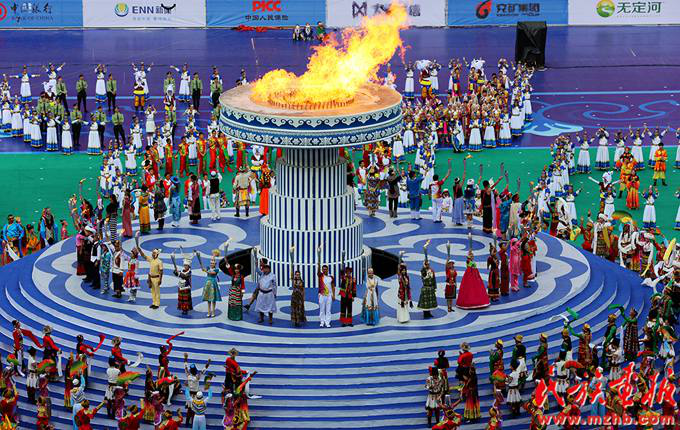 2015年8月9日下午,第十届全国少数民族传统体育运动会在内蒙古鄂尔多斯隆重开幕。56个民族运动员代表共同点燃第十届全国少数民族传统体育运动会的圣火(列来拉杜 摄影)