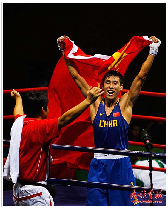 蒙古族拳击运动员张小平获北京奥运拳击比赛金牌(民族画报资料)