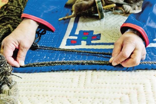 传统毡绣不仅用于工艺品,大多用在生产生活中。苏尼特毡绣技艺的绣制首先从制毡开始,大都在夏末秋初进行。材料多为驼绒线,而纺驼绒线则是用骆驼膝盖绒毛以及驼鬣的细绒手搓而成。
