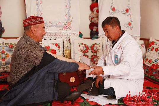 大山里由于情况特殊,有很多孩子是居马泰·俄白克接生的,名字都是他给起的,经常能听到孩子叫他“医生爸爸”。在江苏援疆医生的“传帮带”下,居马泰·俄白克系统地学习了中医针灸技术。掌握新诊疗技术后,他立即奔赴包扎墩冬牧场开展巡诊。他还前往阿勒泰地区参加哈萨克医诊疗技术培训,提升了自己的诊疗技术水平。每年春天,包扎墩库克苏温泉卫生院又会迎来大批患者,为不耽搁放牧,牧民常常早晨8时就来找他看病、输液。居马泰·俄白克一忙就是一天,到晚上他还要为受诊治牧民建立医疗档案,每天都要忙到深夜。