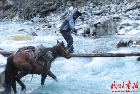 居马泰·俄白克行走在独木桥上(刘灵波  摄影)