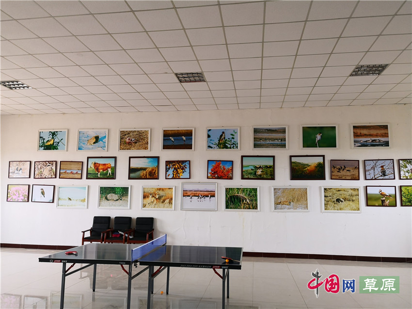 萨如拉图雅嘎查农牧民培训基地展厅,墙上挂满了廷·巴特尔牧场野生动植物摄影作品