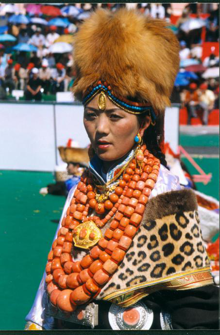 藏族人喜欢珠光宝气的配饰,普遍用珠宝、金银、玉器等配饰物装扮自己,并将其看作是财富和美的象征。藏族的配饰物很多,从头到颈、耳、胸、腰、腕、指、腿、脚都有。